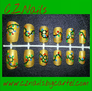 A fun, colorful nail set that has a gold, holographic base color and a string of cute Christmas lights! =)